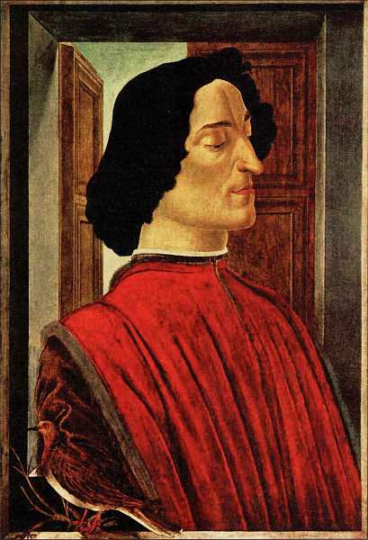 Сандро Боттичелли был близок с семьей Медичи, исполнял их многочисленные заказы и писал портреты членов семьи. Джулиано, родной брат всесильного правителя Флоренции Лоренцо Медичи, считался одним из самых красивых мужчин своего времени. Возлюбленный Симонетты Веспуччи — музы художника, чей облик ясно угадывается в его многих женских образах, был убит в результате заговора, направленного против власти Медичи. Боттичелли создал этот портрет уже после смерти Джулиано, на что намекают символы смерти — голубь, сидящий на сухой ветке, и полуоткрытая дверь на заднем плане. Мастер показал его в резком повороте, почти в профиль, графичным контуром выделил острые черты застывшего, чеканного лица. Контраст создают черные кудри и рубиново-красные тона одежды, подчеркивающие мертвенную неподвижность модели. Глаза Джулиано почти скрыты под опущенными веками, он не смотрит на зрителя, не вступает с ним в диалог. Герой подчеркнуто отстранен и уже принадлежит другому миру.