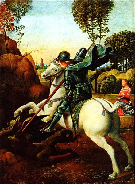 На момент написания этой картины Рафаэлю было немногим больше двадцати лет, но к этому времени он уже считался одним из самых известных мастеров в Италии. В его «Святом Георгии» нет ничего драматичного. Образ христианского воина превращен в прекрасного сказочного рыцаря «без страха и упрека», идеальное олицетворение мужества и благородства. Легкая фигура мужчины на боевом коне, мечтательный образ молящейся принцессы — все это на полотне живописца проникнуто сказочной поэзией и волшебством. Даже сам дракон скорее забавен, чем страшен. Хотя сцена динамична, ей свойственна композиционная уравновешенность и то чувство гармонии, к которому всегда стремился Рафаэль. Лирическая тонкость пейзажного мотива с хрупкими деревцами и холмами округлых очертаний, покрытыми светлой, нежной зеленью, указывает на ранний период творчества художника. Известно, что даже самые незамысловатые живописные композиции Рафаэль тщательно прорабатывал в многочисленных подготовительных рисунках.