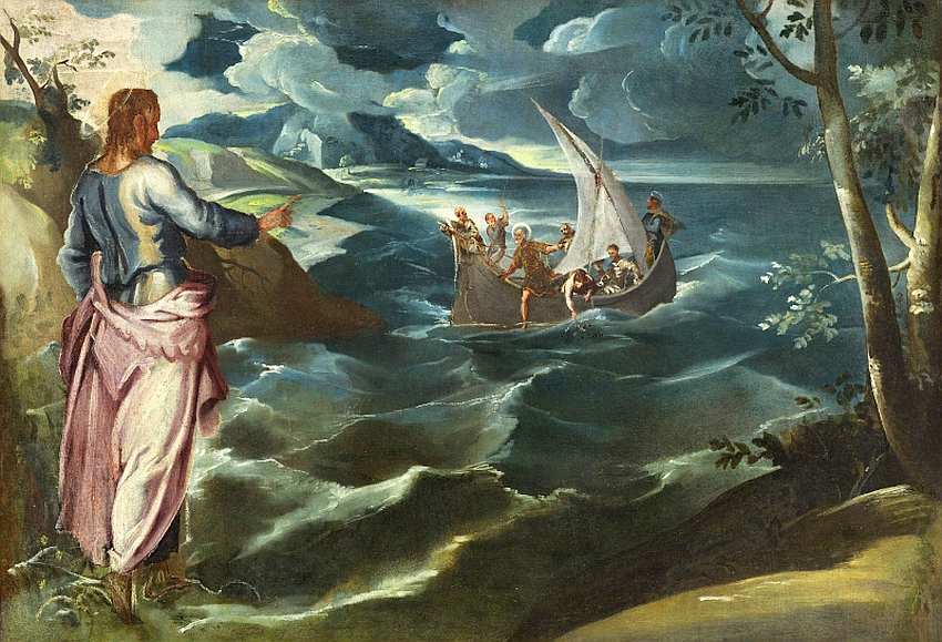 Полотно «Христос на море Галилейском» поражает эмоциональной напряженностью. Здесь изображена сцена, описанная в Евангелии от Иоанна. Господь является своим ученикам, занятым ловлей рыбы. Увидев Христа, Петр бросился в море, чтобы первым встретить своего Учителя. На этой картине впервые в истории живописи героем евангельской драмы стала сама природа. Несущиеся тучи, штормовое море и сверхъестественный свет — все это усиливает напряженность момента, когда человек непреодолимо стремится к Богу. Любопытно, что эту композицию некоторое время считали работой Эль Греко, предполагая, что удлиненная фигура Христа, колорит и драматизм сцены — характерные признаки авторства испанского художника. Однако стоит внимательно приглядеться к фигурам апостолов и небу, и станет ясно, что полотно исполнено в типичной для Тинторетто манере с его смелым рисунком, теплотой и силой красок, широким приемом письма, более мягким, чем у Эль Греко, распределением света и теней.