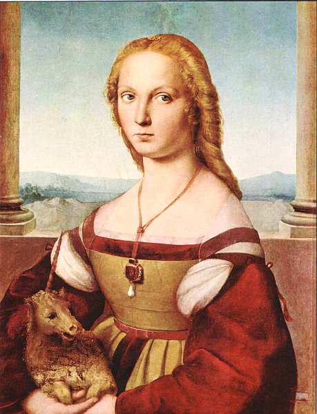 Портрет молодой женщины Рафаэль написал еще во Флоренции, до своего переезда в Рим. На полотне запечатлена флорентийка, одетая в платье, которое было модным в начале XVI века, с пышными бархатными рукавами и узким лифом из муарового шелка. Скорее всего, это свадебный портрет, поэтому на коленях у девушки сидит единорог — символ целомудрия, который был распространен в средневековом искусстве. Золотая цепь на шее изображенной означает крепость супружеских уз, а белая грушевидная жемчужина в подвеске — женское начало, дающее жизнь. Чистотой и естественностью дышит и весь облик девушки, и светлый пейзаж вдали.