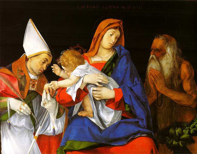 Лоренцо Лотто (около 1480–1556) Мадонна с Младенцем и святыми Флавианом и Онуфрием 1508. Дерево, масло. 51x65