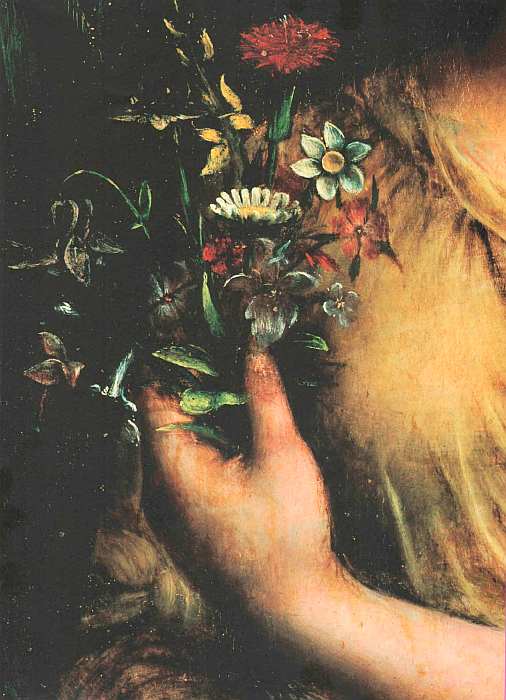 В полотне, на котором изображена римская богиня цветов и садов, все напоминает об искусстве Леонардо: и черты лица молодой девушки, и ее загадочная улыбка, словно освещающая лицо изнутри, и погружающаяся в дымку леонардовского «сфумато» (в переводе с итальянского — «тающий, как дым») фигура, и жест Флоры, держащей букет. Тщательно выписанные цветы восходят к страстным исследованиям природы, которыми занимался учитель. Леонардо отмечал в своих наблюдениях за окружающим миром, что все листья отличаются по цвету и «много более светлыми кажутся деревья и луга, если смотреть на них по ветру», и тому подобное. Оставил он и немало ботанических рисунков. На одном из них изображены разные цветы, которые привлекли пытливое внимание ученого и художника.