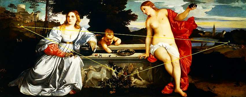 Эта картина — одна из первых в длинном ряду поэтических фантазий Тициана на темы античности, постоянно волновавшей его, неоплатоника по воззрениям. В образе и Любви небесной, и Любви земной, которые могут быть портретом одной женщины, художник изобразил типичную венецианку своего времени — пышнотелую, с золотистой кожей, рыжеволосую. То есть мифическая древность у живописца выглядит ожившей в его дни. В пейзаж на заднем плане он поместил пастуха с отарой овец и сценку охоты на зайца. Вряд ли стоит расшифровывать смысл этих изображений: у Тициана они создают, в первую очередь, ощущение того, что действие на картине происходит в реальности. Но она волшебно преображена фантазией художника, подобно раскинувшемуся вокруг двух женских фигур пейзажу, на который, как и на них, льется вечерний золотой свет.
