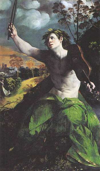 Аполлон, чей культ у древних греков был связан одновременно и с природой, и с искусством, играет здесь на виоле да браччо. Поодаль видна прекрасная нимфа Дафна, в которую, согласно мифологии, бог влюбился и устремился за ней вдогонку, но нимфа, не пожелавшая стать его возлюбленной, превратилась в лавровое дерево. Это был любимый прием венецианских живописцев: отодвинуть назад изображение, раскрывающее сюжет, и вывести на первый план настроение, воплощением которого является главный персонаж. В данном случае этот персонаж — Аполлон, а чувство — необузданная страсть.