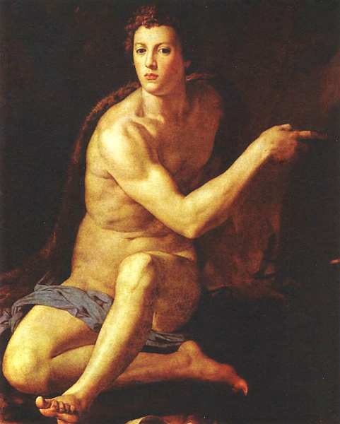 Живопись флорентийского художника Аньоло Бронзино отразила особенности, присущие маньеризму — направлению, которое пришло на смену Высокому Возрождению. Прежде всего это интерес к форме: она у живописца нарочито усложняется. Его Иоанн Креститель напоминает фигуры с росписи Микеланджело Буонарроти на плафоне Сикстинской капеллы, и это неспроста: маньеристы стремились осмыслить наследие предыдущей эпохи. Но Бронзино идет дальше Микеланджело во внешней сложности изображенного: Иоанн сидит в позе, словно закрученной по спирали — левая нога впереди, правое плечо развернуто вперед, а рука уходит назад. Слегка удлиненное тело и оттенок нежной красоты, лежащий на облике юноши, тоже были особенностями новой живописи. Свет, заливающий фигуру, придает ей некоторую отстраненность от зрителя: изображенный здесь Иоанн словно существует в особом, созданном кистью художника мире.