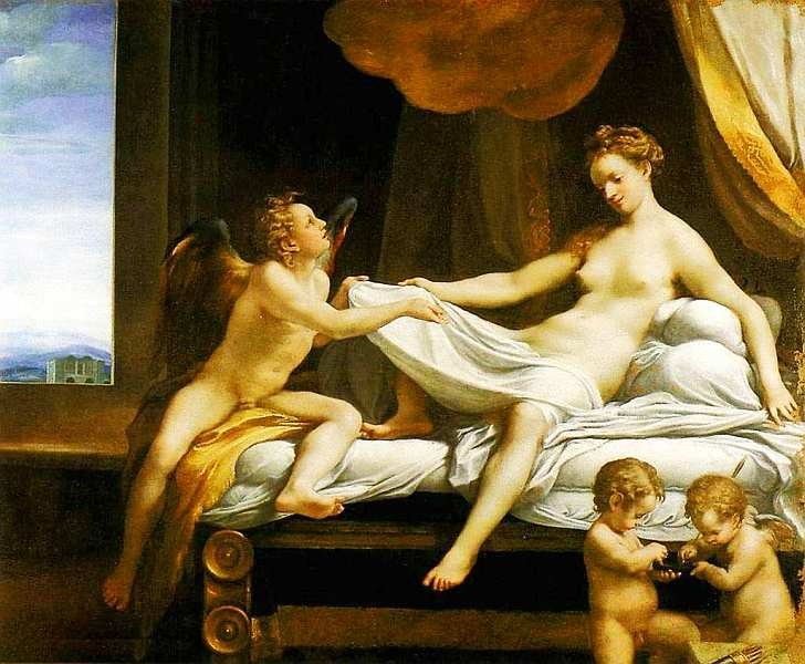 Оттого данная работа, известная под разными названиями, — это не только игра художнической фантазии на темы мифологии: Венера завязывает глаза Амуру, а одна из нимф подает ему лук, чтобы любовные стрелы были пущены наугад. Внимание привлекают, прежде всего, прекрасные женщины, их лица с классическими чертами, светло-золотистая кожа, шелковистые волосы, мягкие жесты. Венера полна спокойного достоинства, исходящая от нее живая, согревающая все вокруг теплота подчеркнута уткнувшимся в плечо богини любви Амуром — он прильнул к ней, как ребенок к матери. Красота обретает на этой картине материнское, животворящее начало.