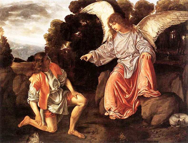 Художник из Брешии Савольдо развивал в своем искусстве традиции венецианской живописи, находясь под влиянием Джорджоне и Тициана. В этой картине он обратился к сюжету из неканонической книги Библии о том, как Товий, чья семья обеднела из-за болезни отца, Товита, решил по дороге к человеку, который должен был его отцу деньги, вымыться в реке и увидел в ней рыбу. Спутник Товия сказал, чтобы он хватал эту рыбу: ее желчь способна исцелить слепого Товита. Впоследствии оказалось, что тот, кто сопровождал юношу, был архангелом Рафаилом.