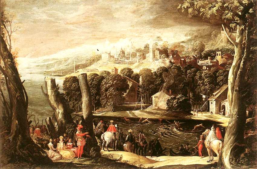 Раскинувшийся на полотне сияющий пейзаж, в котором видна каждая травинка и волна в реке и в то же время отмеченный космическим размахом, напоминает картины нидерландских мастеров и представителей дунайской школы живописи, особенно Альбрехта Альтдорфера. Это пейзаж реалистический и романтический одновременно, отсюда и впечатление сказки, создаваемое этим ландшафтом и таинственным городом вдали. Но данный холст — образец живописи маньеризма, в нем чувствуются изящество и стремление художника к игре.