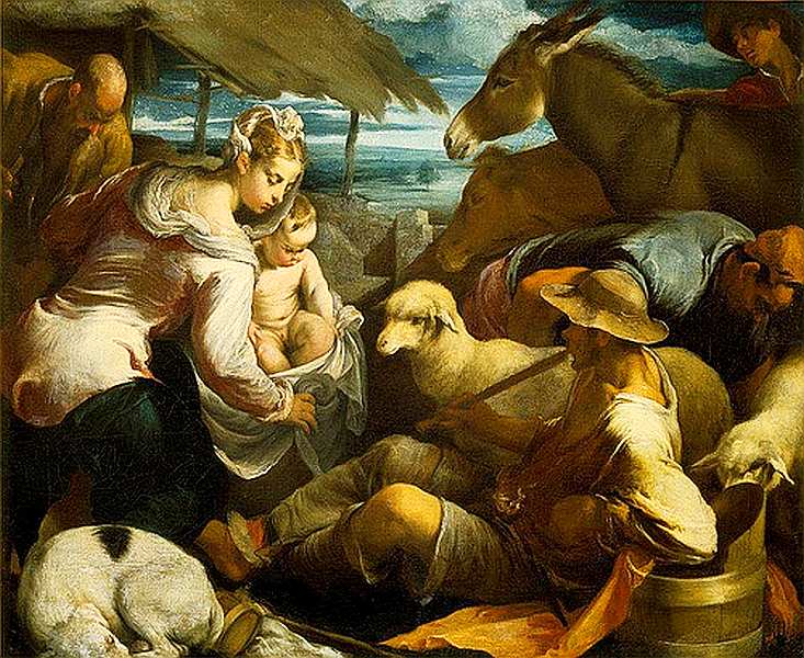 Так, Богоматерь в этом «Поклонении пастухов» стоит вполоборота к зрителю, и данный ракурс позволил художнику передать Ее тонкий и нежный профиль, трепетность и изящество. В то же время с фигур Марии и стоящего за Ее спиной Иосифа в картине начинается сложное движение, которое идет от Богоматери к Младенцу, затем к пастуху, развернутому боком к передней плоскости холста, и возвращается, описав «восьмерку», к началу. Несмотря на то что изображено всего несколько пастухов, создается впечатление, что пришедших поклониться Младенцу много. На полотне буквально нет свободного места: Бассано поместил сюда овец, собаку, сторожившую стадо, а теперь свернувшуюся калачиком в углу, присутствовавших при рождении Иисуса вола и осла. Это произведение вызывает в памяти слова из 150-го псалма Давида: «Все дышащее да хвалит Господа!»