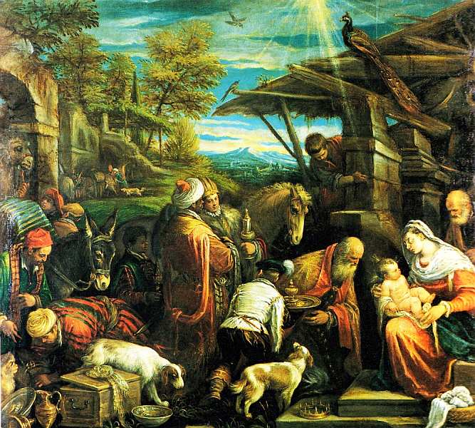 Бассано, любивший наполнять свои полотна бытовыми подробностями, поместил здесь серебряное блюдо, золотой кувшин, полуоткрытый сундук, который обходит собака, лежащую рядом с одним из волхвов его корону, стоящую у ног Богоматери корзину с пеленками. Художник тщательно изображал все, что создавало ощущение реальности происходящего, например хлев, в котором родился Иисус. Но мастер испытывал и тягу к волшебному, ощущение которого всячески усиливал в своем произведении: вдали расстилается переливающийся дивными красками пейзаж, и надо всем сияет указывавшая волхвам путь Вифлеемская звезда.