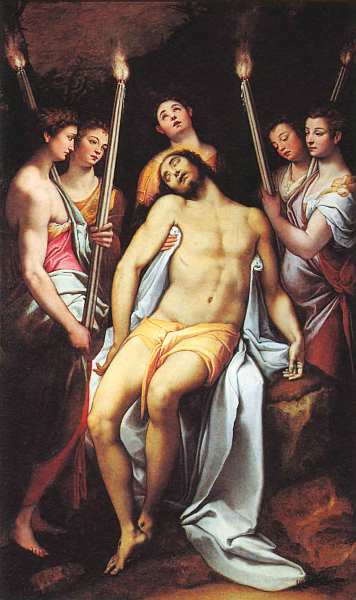 В пещере, где должно состояться погребение Иисуса, вокруг Него с факелами в руках стоят ангелы. Один из них, подняв глаза к небу, поддерживает Его тело, в изображении которого художник вдохновлялся искусством Микеланджело Буонарроти. Мощный торс Христа у Дзуккари восходит к росписям Сикстинской капеллы, а Его поза и вытянутое отяжелевшее тело напоминают последнюю работу Микеланджело — скульптурную группу «Пьета Ронданини» (1552–1564, замок Сфорца, Милан). Однако в удлиненных фигурах ангелов, несколько искусственных цветах одеяний, бесконечных гибких линиях и нарочитой красоте всего изображенного видна кисть маньериста.
