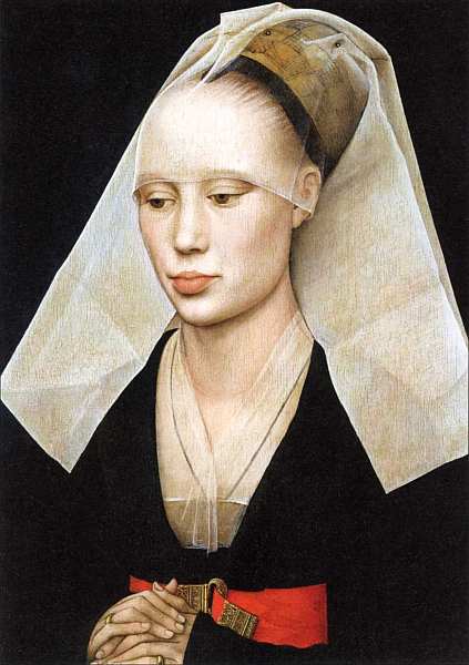 Крупнейший мастер нидерландского Возрождения, Рогир ван дер Вейден был выдающимся художником-портретистом, ярким подтверждением чему является «Портрет дамы», столь же прекрасный, сколь и загадочный. Вейден изобразил по пояс молодую женщину в трехчетвертном повороте на темном фоне, благодаря которому ничто не отвлекает от созерцания светлого лица модели с выщипанными по моде того времени бровями. Лицо модели изящно освещено, но на ее коже не видно контрастов цвета. Высокий лоб, украшенный прозрачным головным убором, кажется куполовидным. Типичная черта искусства Ван дер Вейдена — осторожная детализация булавок, фиксирующих вуаль. Черное платье затянуто красным шелковым поясом чуть ниже груди. Женщина погружена в себя, ее глаза опущены, а сложенные руки и крепко сжатые тонкие пальцы говорят о закрытости от окружающего мира. Психологическая характеристика модели указывает на созерцательную, даже аскетичную натуру, но полные губы выдают и другую — чувственную и страстную, что наводит на мысль о нерешенном конфликте в ее индивидуальности.