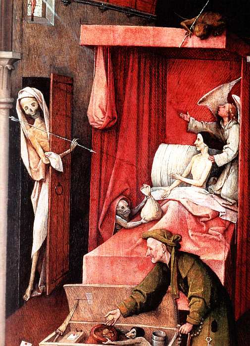 На длинной, вытянутой по вертикали картине изображена притча об алчности. Действие происходит постепенно, снизу вверх. На первом плане оружие и доспехи намекают на власть и силу как первоначальный источник достатка. Со временем богатство нарастает посредством ростовщичества, и им овладевают крысы и саламандры. В руке у богача — четки, на поясе висит ключ от сундука. Последняя сцена — скупой стоит перед выбором: остаться при деньгах, взять мешок с монетами, которые ему протягивает Алчность с жабьим лицом, или послушаться ангела-хранителя и обратить свой взор к распятию и Богу. За человеком внимательно следит Дьявол, свисающий с высокого полога его кровати, а тощая Смерть в дверном проеме ждет решения богача — от нее ему уже в любом случае не укрыться. Крылатый карлик на первом плане у барьера — своеобразная подпись Босха. Возможно, это автопортрет мастера, который с улыбкой размышляет о богатстве и смерти.