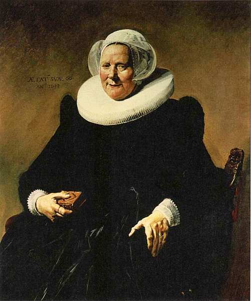 В представленной картине художник великолепно передал облик пожилой женщины, спокойный взгляд которой обращен непосредственно на зрителя. Она смотрит с вниманием, интересом и доброжелательностью, легкая улыбка, тронувшая ее губы, говорит о спокойной уверенности и жизнерадостности. Халс использовал все богатство фактурных приемов. Ловкими и точными мазками теплого бежевого, коричневого и розового цвета он вылепил вполне современное лицо женщины. Сколько оттенков белого в пастозно написанном кружевном воротнике и чепце, а тени и фон покрыты тонким, почти прозрачным слоем краски! Быстрые, но одновременно точные и рассчитанные движения кисти создали законченный живописный образ, полный необычайной жизненной активности.