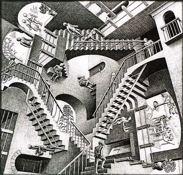 На литографии «Относительность» изображен некий парадоксальный мир, в котором не действуют законы физики. В нем объединены три реальности, три силы тяжести направлены перпендикулярно одна другой. Главный герой работы — лестница, вокруг нее происходит все действие. В некой придуманной архитектурной структуре различные пространства объединены лестницами. Для людей, живущих в этом мире, но в разных плоскостях, одна и та же лестница будет направлена или вверх, или вниз. Произведение может быть рассмотрено с различных точек зрения. Даже если перевернуть литографию вверх ногами, то зритель лишь переместится в другую реальность, а структура и замысел картины ничуть не пострадают.