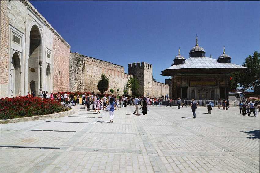 Сегодня у парадных ворот Топкапы всегда кипит жизнь — тысячи посетителей входят через них. Фонтан, к сожалению, давно не работает, но уличные торговцы, как и много лет назад, предлагают всем желающим прохладительные напитки и восточные сладости.