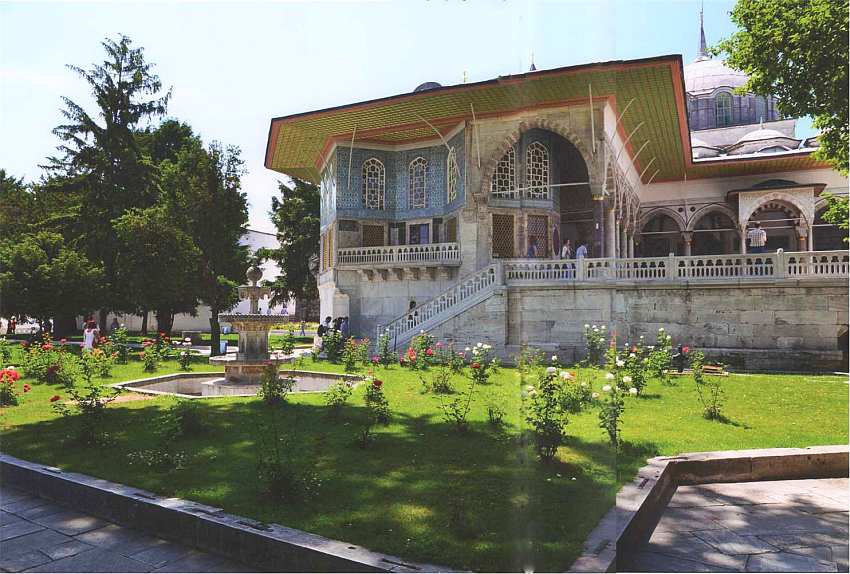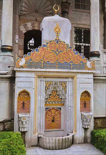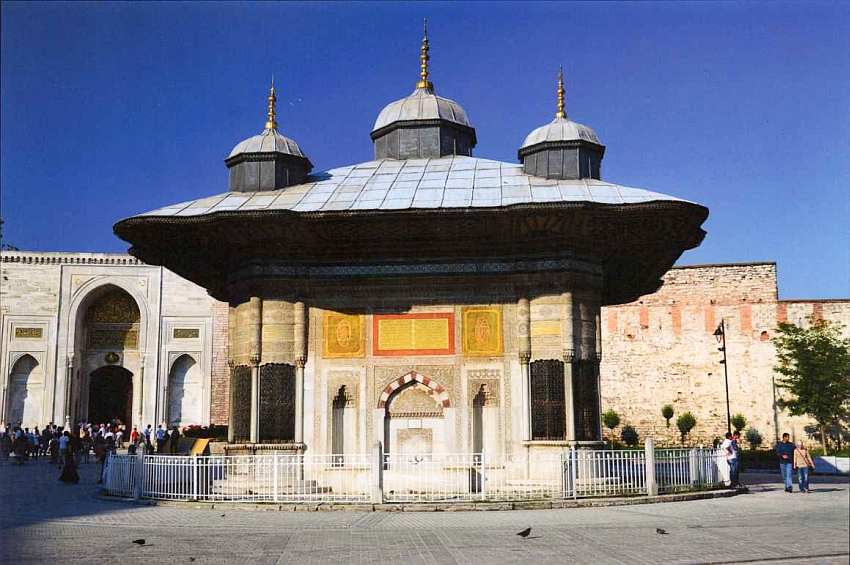 На площади у парадных ворот дворца Топкапы, недалеко от стены, имеется кубическое здание с пятью куполами. Это фонтан в стиле османского барокко, совершенно непривычный для европейского взгляда, сооруженный на средства султана Ахмеда III в 1728 на месте древнего византийского фонтана. Его стены отделаны разноцветным мрамором, покрытым сложной резьбой. Фонтан имел важное практическое и символическое значения: некогда с четырех его сторон в небольшие каменные ванны изливалась вода, которую могли набирать все желающие. Все стороны оформлены по-разному, что непривычно для европейской архитектуры, одинаковое только расположение бассейнов.