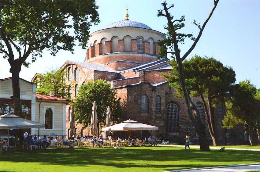 Налево от первых ворот дворцового комплекса расположена церковь Святой Ирины — один из старейших сохранившихся в Константинополе храмов. Первая церковь здесь была возведена еще в начале IV века при императоре Константине на месте руин древнего храма Афродиты. Она являлась главным храмом города до постройки собора Святой Софии в VI веке и считалась резиденцией Константинопольского патриархата. Вместе с собором Святой Софии — Премудрости Божией — церковь Святой Ирины, то есть Мира, составляла своеобразную пару, которая прославляла основные добродетели правителей Византии, владык всей православной вселенной — мудрость и поддержание всеобщего мира.