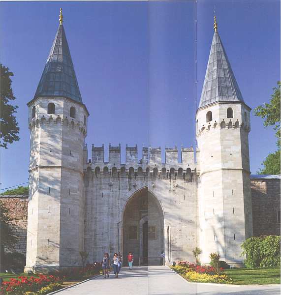 На территорию дворового комплекса Топкапы посетители, как и несколько столетий назад, могут попасть через огромные парадные ворота — Баб-и-Хумайюн (Ворота султана), находящиеся сзади собора Айя-Софии. Они были построены еще в XV веке по приказанию первого турецкого владыки Стамбула — султана Мехмеда Фатиха. Некоторые исследователи полагают, что именно величественные ворота резиденции правителя высотой 20 м дали основание европейским послам именовать все турецкое государство Высокой или Блистательной Портой (то есть порталом, воротами), именно так называли Османскую империю во многих европейских странах. Из надписи над воротами можно узнать, что их возвели в 1478 и первоначально строение имело два этажа. Верхний павильон для султана Мехмеда не сохранился до наших дней. Когда-то правитель и женщины его гарема могли наблюдать сверху за всеми торжественными шествиями, которые начинались и завершались во дворце.