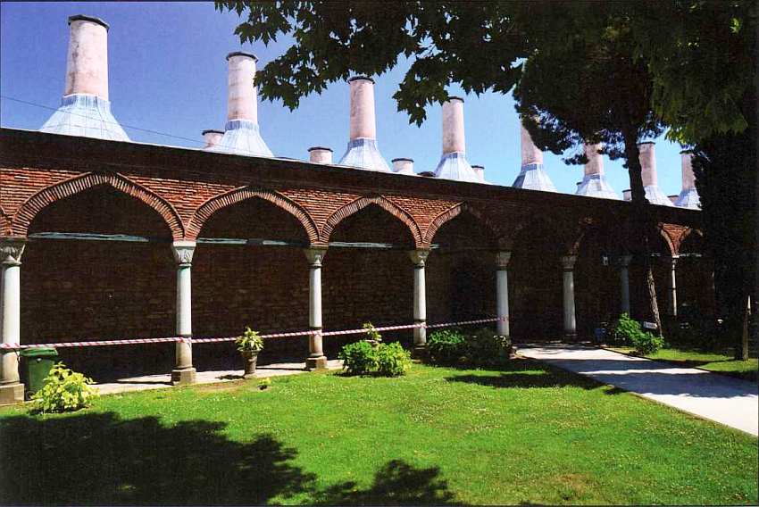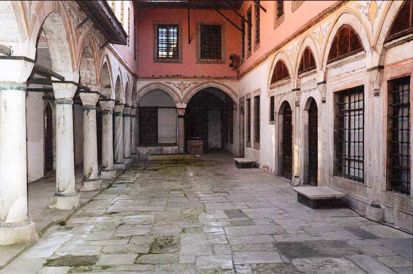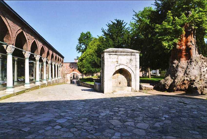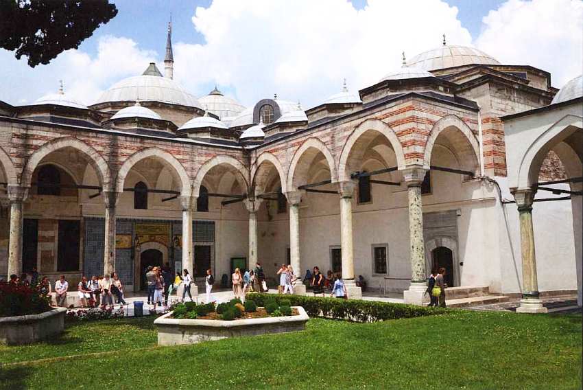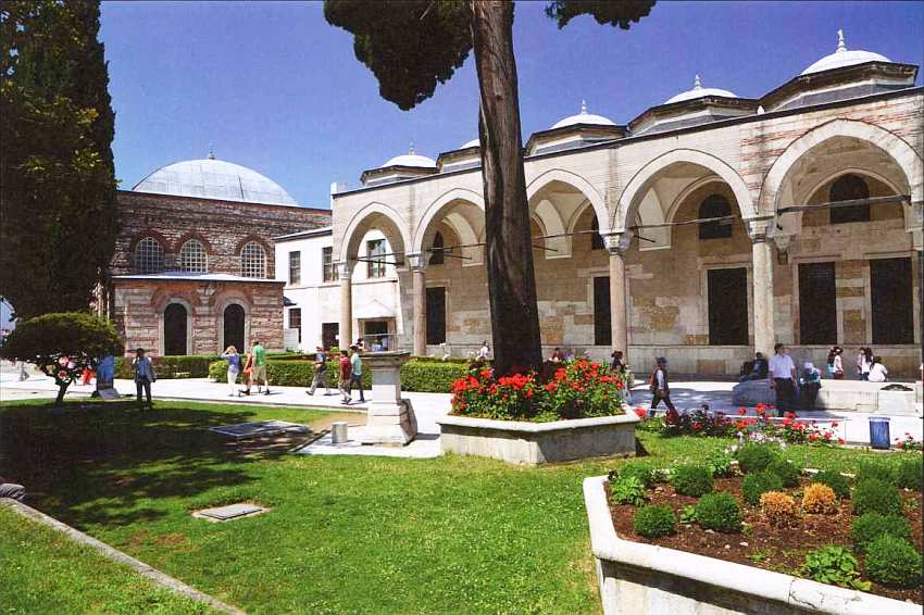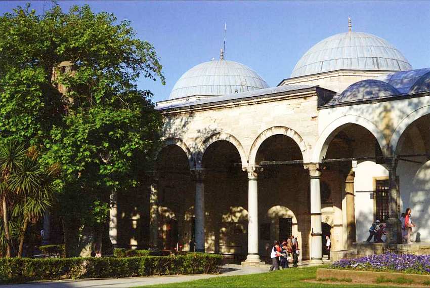 Слева располагается здание мечети белых евнухов — главных хранителей султанского гарема. Оно сложено из красного кирпича и белого камня. Интересно, что в настоящее время это одна из немногих мечетей на территории комплекса. В отдельной дворцовой мечети султаны необходимости не испытывали, ведь Айя-София была совсем рядом.