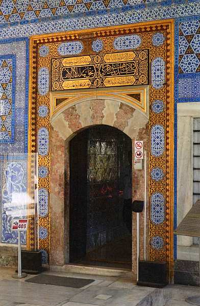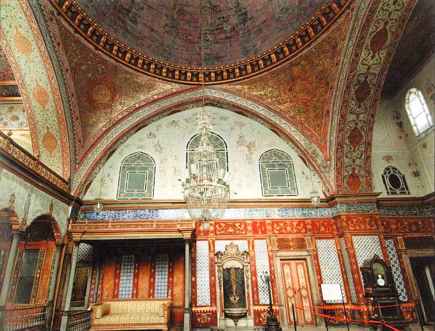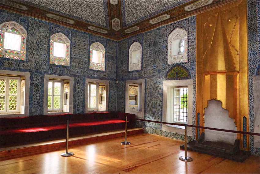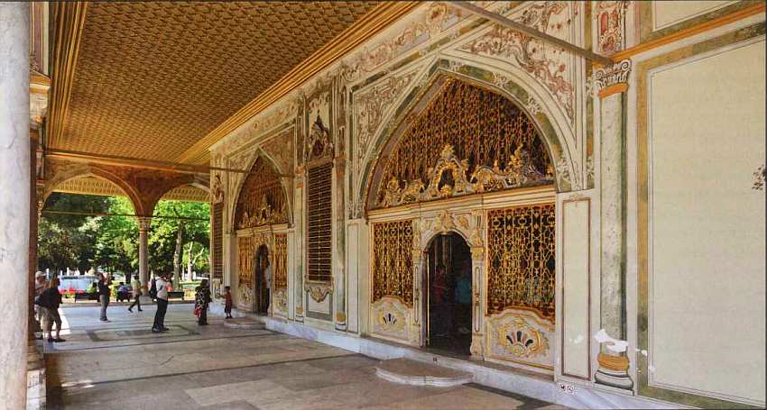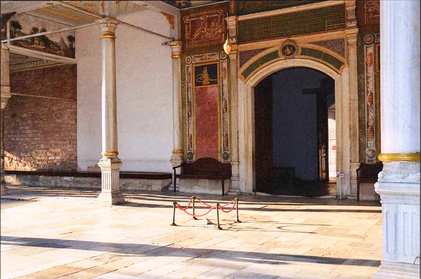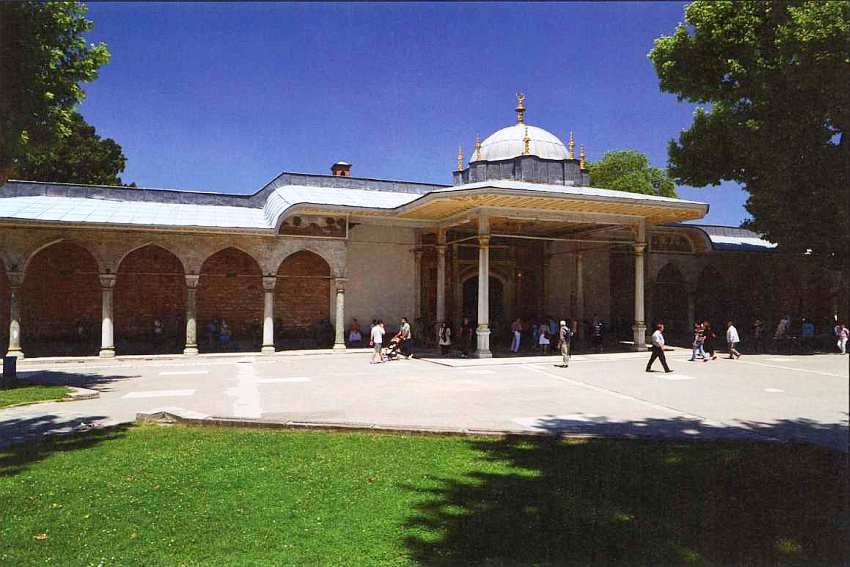 Третьи ворота Топкапы имеют сразу три названия: Ворота аудиенций, Ворота Блаженства и Ворота белых евнухов. Первое название понятно: нередко аудиенции иностранным послам давались под открытым небом, и тогда весь Диван Мейданы превращался в большой парадный зал, а портик ворот служил балдахином над троном султана. Второе название (Баб-ус-сааде) также понятно: как еще в Османской Турции должны были называть вход на территорию личных покоев султана? Последнее название связано с близостью помещений, занимавшихся белыми евнухами. Ворота Блаженства считались личными воротами повелителя, поэтому их порог должен был целовать каждый, допущенный переступить через него. В обычные дни, когда не было протокольных торжеств, ими не пользовались. Сразу за Воротами Блаженства находится самое главное здание дворцового комплекса — Тронный зал, олицетворяющий все могущество султанской власти.