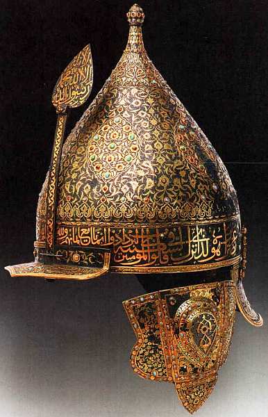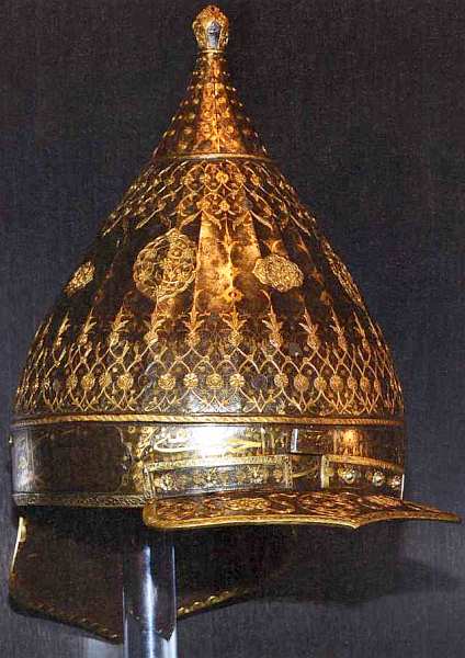 Форма железного шлема, выполненного в середине XVI века, традиционна: он имеет высокое навершие, козырек, стрелку, которая защищала лицо, науши и назатыльник. Конический купол густо украшен золотой гравировкой с растительным орнаментом. В золотые касты в виде цветочных розеток вставлены любимые на Востоке камни — рубины и бирюза, которым придавалось особое символическое значение. Согласно поверьям, рубин наделял своего владельца смелостью и отвагой, а бирюза приносила счастье и удачу. Поэтому неудивительно, что этими камнями украшались многие предметы, в том числе оружие и доспехи. По венцу идет насеченная золотом надпись, содержащая четыре первых айата (стиха) суры «Победа» из Корана. Над надписью помещен фриз из пальметт, украшенный чередующимися рубинами и бирюзой. На козырьке и назатыльнике также написаны айаты из Корана, которые должны были давать защиту свыше владельцу шлема. Внутри пальметты на навершии носовой стрелки нанесена формула единобожия.