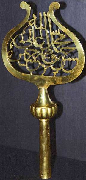Промежуток между рогами заполнен арабской вязью. Надписи на алемах, независимо от конкретного содержания, должны были выполнять роль талисмана. Трубка изделия простая, круглой формы, шар (яблоко) в верхней части декорирован мягкими чеканными узорами.