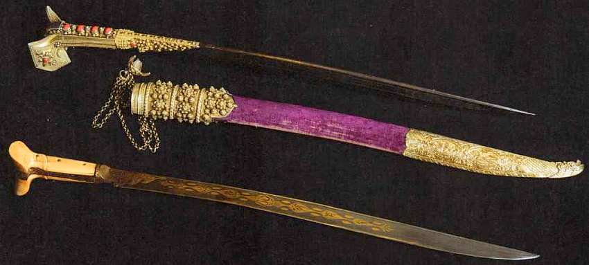 Эфес ятагана не имеет гарды, а только уши — расширение для упора руки. Форма вытянутого, достаточно легкого клинка позволяет наносить и рубящие, и колющие удары. Нижний ятаган имеет золоченое украшение верхней части клинка и практичную рукоять из слоновой кости. Это ранний тип данного вида оружия, он относится к XVI веку, когда турецкие султаны еще лично возглавляли войско во время походов. Верхний ятаган с рукоятью, декорированной вставками из коралла, и пышно украшенными ножнами представляет собой чисто декоративное оружие и был выполнен в XIX веке.