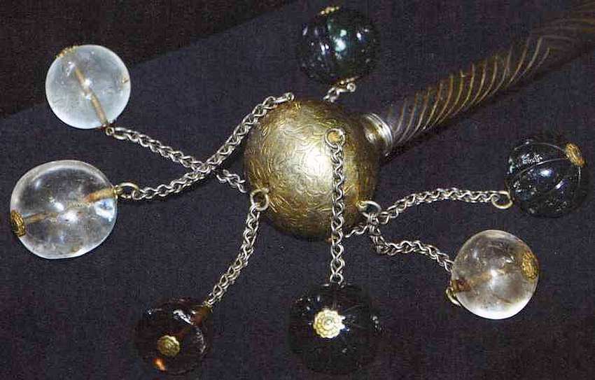 Достаточно длинная рукоятка плети (более 40 см) выполнена в виде булавы — традиционного символа власти полководца. Она украшена спиралевидными узорами, имитирующими обмотку полосами кожи на настоящем боевом оружии. К ее концу крепится еще петля из небольшой цепи для подвешивания. Навершие и часть рукояти позолочены. На навершии можно рассмотреть растительные узоры, среди которых есть и любимые в Турции цветы тюльпана. К нему прикреплены на цепях семь боевых ядер, выполненых в виде шаров из натуральных камней — горного хрусталя, топаза и других. Шары просверлены и закреплены на металлических стержнях с помощью небольших заклепок. Вполне понятна благожелательная символика числа ядер — семь, что должно было приносить владельцу такой вещи удачу.