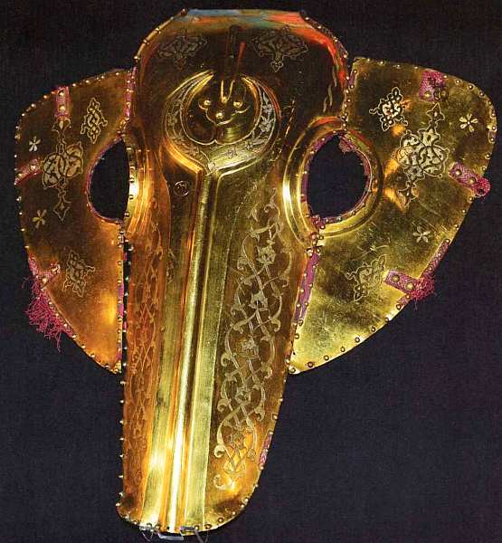Хотя в странах Востока обычно не было тяжеловооруженных всадников и там не понимали европейских рыцарей, которые вместе со своими конями нередко были целиком закованы в железные доспехи, о защите для лошади все же нужно было думать, ведь в бою от коня очень часто зависела жизнь всадника. Однако сегодня трудно сказать, связано ли появление подобного конского шлема с военной необходимостью или все-таки большее значение имела пышность убранства коня во время торжественных церемоний.