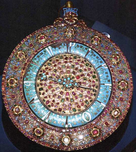 В XVII–XVIII веках механизмы для подобных часов обычно доставлялись в Турцию из Европы, а корпус выполнялся придворными мастерами. Данные настенные часы — один из редких образцов коллекции Топкапы, которые точно следуют форме европейской астролябии. Их корпус почти плоский, сверху — петля для крепления на стене. Благодаря форме в Турции подобные часы часто сравнивали с круглыми щитами-калканами.