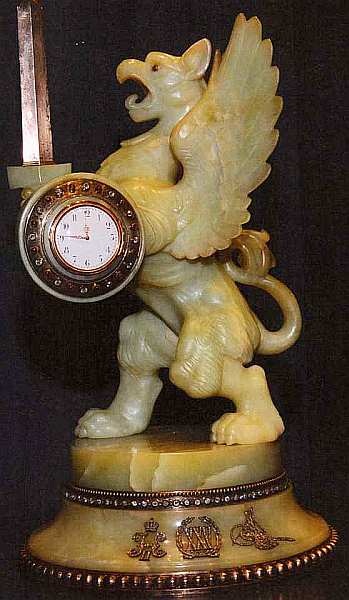 Один из таких подарков хранится в коллекции часов музея Топкапы. Это подарок последнего российского самодержца Николая II султану Абдул-Гамиду II. Надо сказать, что к началу XX века почти все правители Европы были лично знакомы между собой, турецкие властители неоднократно приезжали в Париж и другие столицы с государственными и частными визитами. Однако в России ни один из правителей Османской империи в связи с не всегда безоблачными отношениями между двумя странами не бывал. Тем не менее император Николай счел своим долгом в 1901 отправить в Стамбул дорогостоящий подарок к 25-летнему юбилею правления султана — настольные часы в виде стоящего на задних лапах грифона, вооруженного мечом и круглым щитом. Это существо — главная фигура родового герба династии Романовых. Грифон выполнен из светло-зеленой яшмы. Циферблатом является щит в его левой лапе, окружность которого инкрустирована 24 чередующимися рубинами и бриллиантами. По постаменту часов также проходит поясок из бриллиантов. Нижняя часть постамента украшена тремя бриллиантовыми вставками — вензелем Николая II, тугрой султана Абдул-Гамида II и латинской цифрой 25 в лавровом венке.