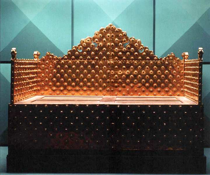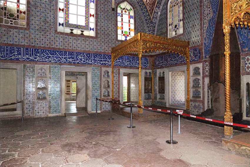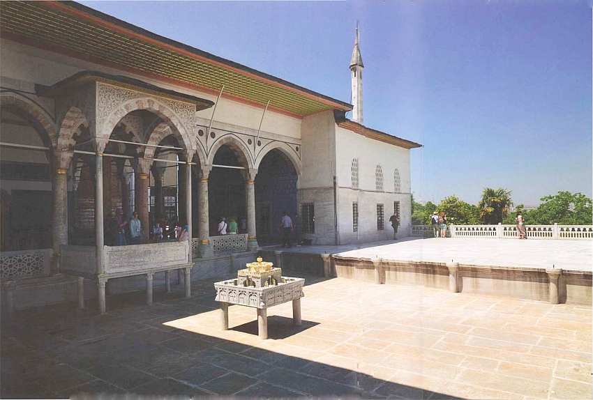 Хотя в наши дни посетители музея допускаются в третий двор через Ворота Блаженства, все равно под ними есть место, куда нога простого смертного доныне ступать не должна. Здесь огорожен участок, где когда-то стоял личный штандарт падишаха — алем, перед ним находился трон владык Османской империи. Именно сюда его из внутренней сокровищницы выносили служащие — алебардщики-балтанджи. Место трона обозначено не только на каменном полу, но и сверху, где с потолка спускается позолоченная подвеска, которая в странах Востока традиционно дополняла балдахин трона. Собрание самих султанских тронов, а также штандартов-алемов, бережно охранялось и дошло до наших дней в коллекции музея Топкапы.