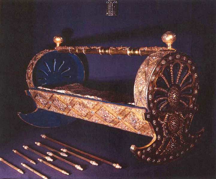 Обратим внимание, прежде всего, на вещи, имевшие особое церемониальное значение и использовавшиеся во время выхода войска на войну, его торжественного возвращения из победоносного похода, во время смотров и парадов. К числу таких предметов, несомненно, относился парадный шлем. Он традиционно имеет коническую форму и высокое вытянутое завершение. Это было обусловлено чисто боевой необходимостью — с такого шлема скользил почти любой удар, и его практически невозможно было разрубить. Кроме того, шлем имел назатыльник для защиты шеи и козырек, прикрывавший лицо. Судя по сохранившимся деталям, через последний когда-то была пропущена еще подвижная стрелка для защиты лица от поперечного удара.