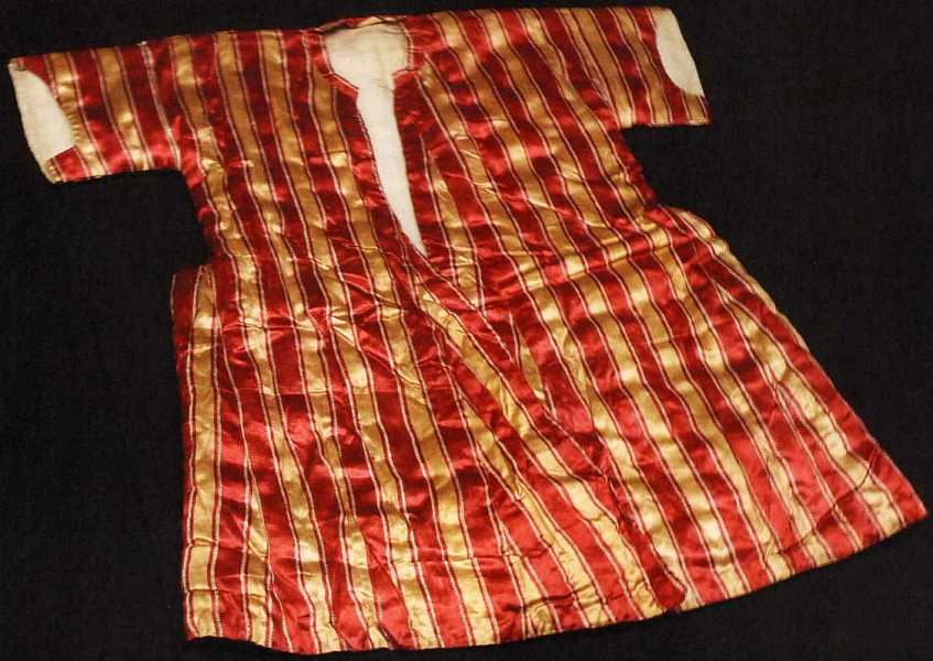 Детский кафтан сшит из яркого шелка, который был широко распространен в XVII веке по всей Европе. На Руси благодаря этим полоскам такая ткань назвалась «дороги». Шелк с чередующимися красными и желтыми полосами говорит о царственном статусе владельца такой одежды. Здесь хорошо виден оригинальный крой кафтана — косые полы, которые образуют своеобразную широкую юбку. Нижняя часть одеяния расширена за счет вставки дополнительных клиньев.