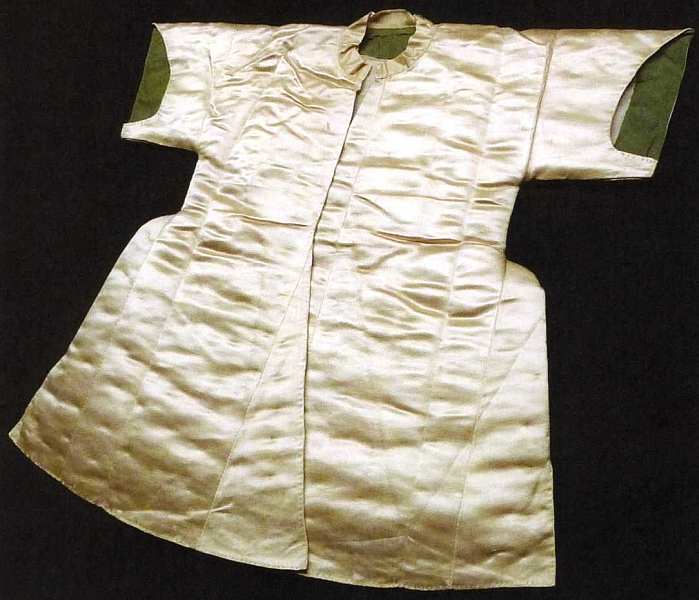 Данный детский кафтан сшит из светлого однотонного атласа и имеет подкладку из темно-зеленой ткани. По поводу фасона нужно отметить, что в течение долгих столетий одежда детей полностью копировала одежду взрослых. Кафтан имеет короткие рукава и небольшой воротник в виде присобранной стойки. Отсутствие застежки может говорить о том, что такую вещь носили исключительно с поясом. Возможно, что в комплект детской одежды также входили широкие штаны — шальвары.