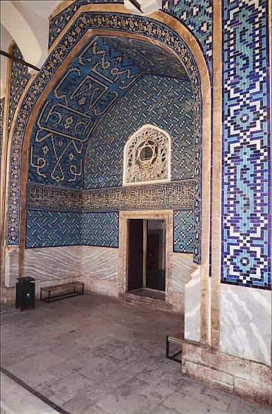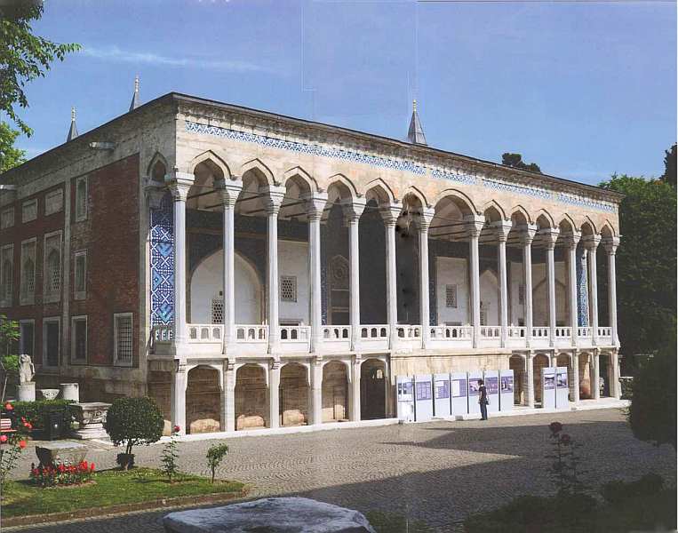 Не вполне понятна и история отделки его помещений. Если общий план этого строения был составлен в персидских традициях, то интерьеры, безусловно, — турецкие — внутри и снаружи павильон отделан чудесными изразцами, выполненными в городе Изник, где их производство было налажено еще в XIV веке. Бирюзово-голубые изразцы с цветочным рисунком, относящиеся к так называемому первому изникскому периоду, сохранились в нише лоджии. Обычно они использовались для отделки мечетей и других религиозных сооружений. Применение их в светских постройках, подобно летнему павильону султанской резиденции, было исключением.