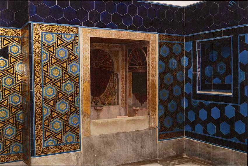 Во внутренних помещениях дворца первоначальные изразцы в XVI–XVII веках были заменены на новые. Они не менее красивы — с золотыми и белыми звездами и многоугольниками на ярко-синем фоне.