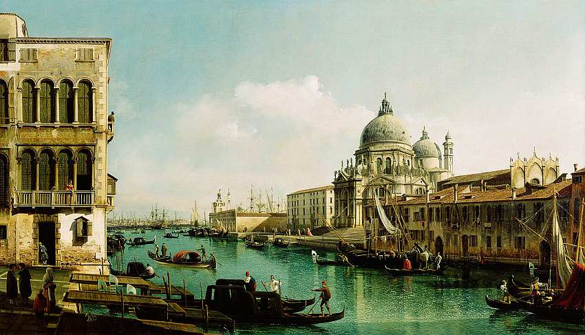 Данное полотно относится к началу творчества живописца, когда он еще учился у Каналетто. Ведуты были популярны в Венеции, их с удовольствием приобретали путешественники, чтобы иметь дома кусочек удивительного города на воде. На этом холсте на левом берегу расположено палаццо Пизани-Грити, фасад которого украшают арочные оконные проемы. На противоположном — церковь Санта-Мария делла Салюте, она доминирует в пейзаже правого берега. Виднеющийся готический фасад — аббатство Сан-Грегорио. На канале много гондол и парусных лодок, горожане заняты повседневными делами. Беллотто показывает Венецию такой, какой ее мог видеть любой его современник.