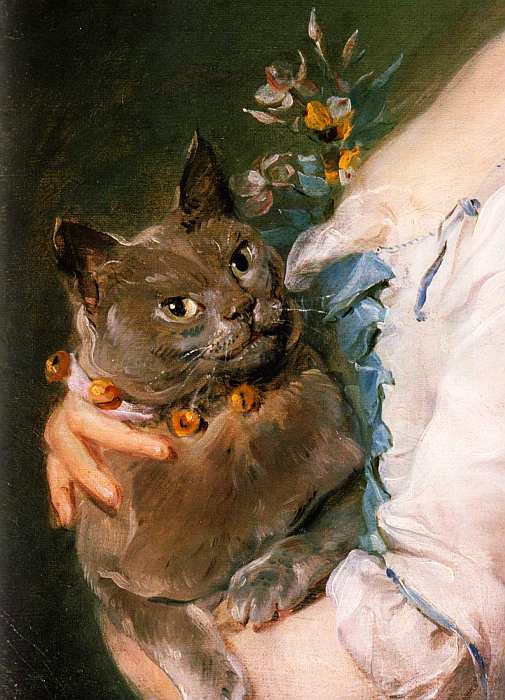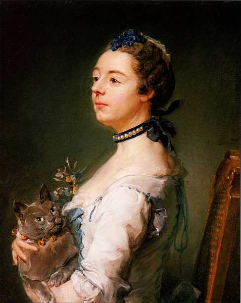 Живописец передавал характер и эмоциональное состояние героя через жесты, осанку, выражение лица, индивидуальность позы. Так, например, Магдалену де ла Гранж он изобразил в сильном трехчетвертном повороте к зрителю. Она сидит с прямой спиной, не касаясь спинки стула. Ее взгляд устремлен вдаль. На руках женщина держит большого серого кота. Ошейник питомца декорирован золотистыми колокольчиками. Украшение модели — темная атласная лента, расшитая крупными жемчужинами. Колорит произведения, построенный на сочетании оливковых, голубых и охристых тонов, отличается изысканностью.