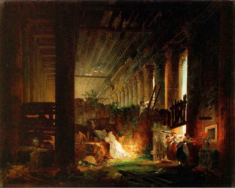 Юбер Робер — известный французский живописец, декоратор, рисовальщик и гравер. Он был крупнейшим мастером архитектурного пейзажа с руинами и даже получил прозвище Робер Руинный. Художник учился у скульптора Р. М. Слодтца и живописца П. Ж. Каза. В 1754 он поступил во Французскую академию в Риме. Атмосфера, которая царила в Италии в это время, увлечение Античностью и археологическими раскопками определили тематику работ Робера. Много путешествуя, он делал большое количество зарисовок, впоследствии использовал их для картин.
