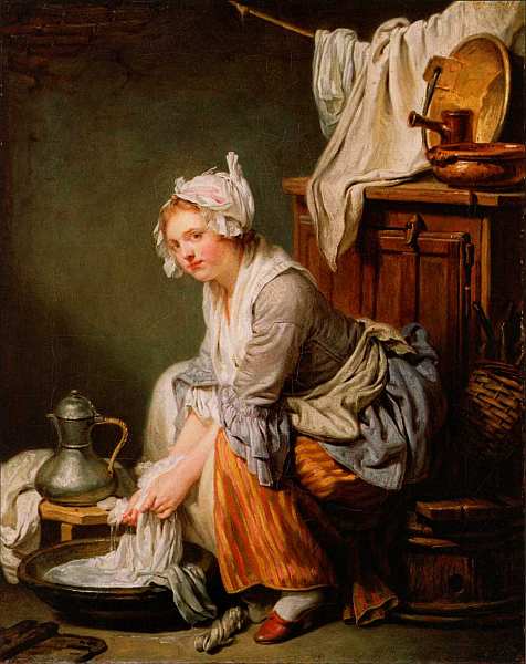Например, на холсте «Прачка» он изобразил девушку, занятую стиркой. В полутемной комнате находятся вещи: грязные, чистые, развешенные на просушку, мокрые, только что постиранные. Милая героиня в атласном платье сидит на невысокой кадке, согнувшись над тазом. Ее поза кажется неудобной для долгой стирки. Девушка лукаво и с некоторым вызовом смотрит на зрителя. За ее спиной на шкафчике стоят несколько тазов, натянута веревка, на которой сушится белье. Когда это полотно впервые появилось на выставке, критик Дени Дидро написал: «Эта маленькая прачка очаровательна, но она плутовка, я не стал бы доверять ей ни на дюйм».