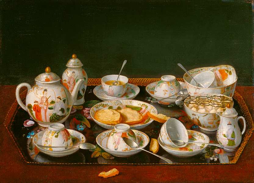 На столе стоит поднос с сервизом на шесть персон. Чай уже выпит, а чашки либо опрокинуты, либо перевернуты. Помимо них здесь находятся заварочный чайник, молочник, тарелка с бутербродами, миска и ваза с крышкой. Лиотар расположил дорогую посуду и серебряные ложки на простом и дешевом подносе.